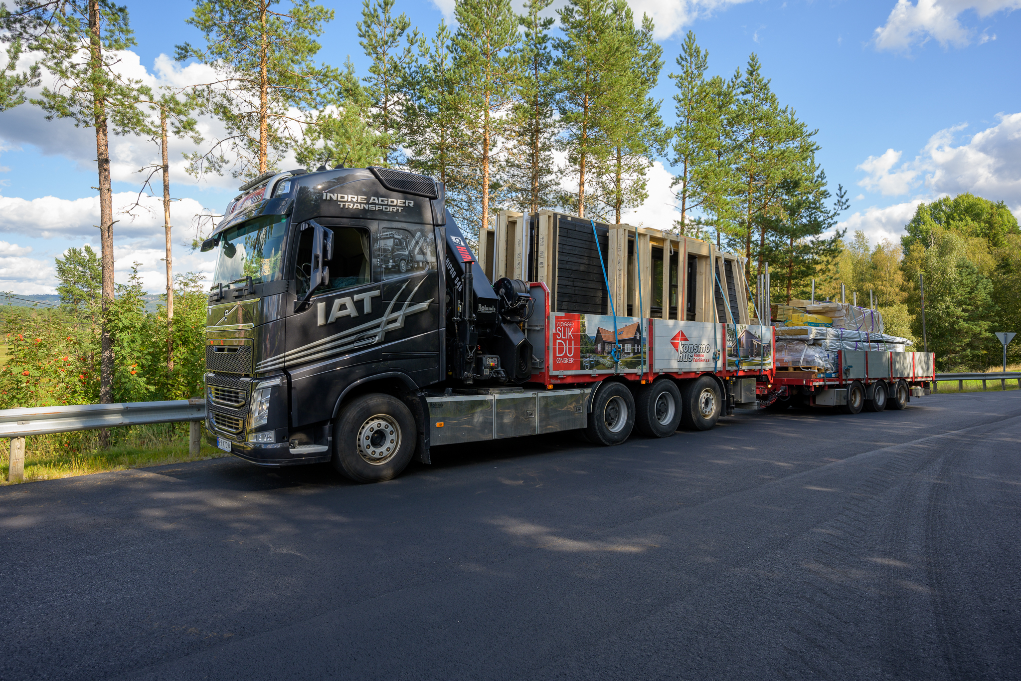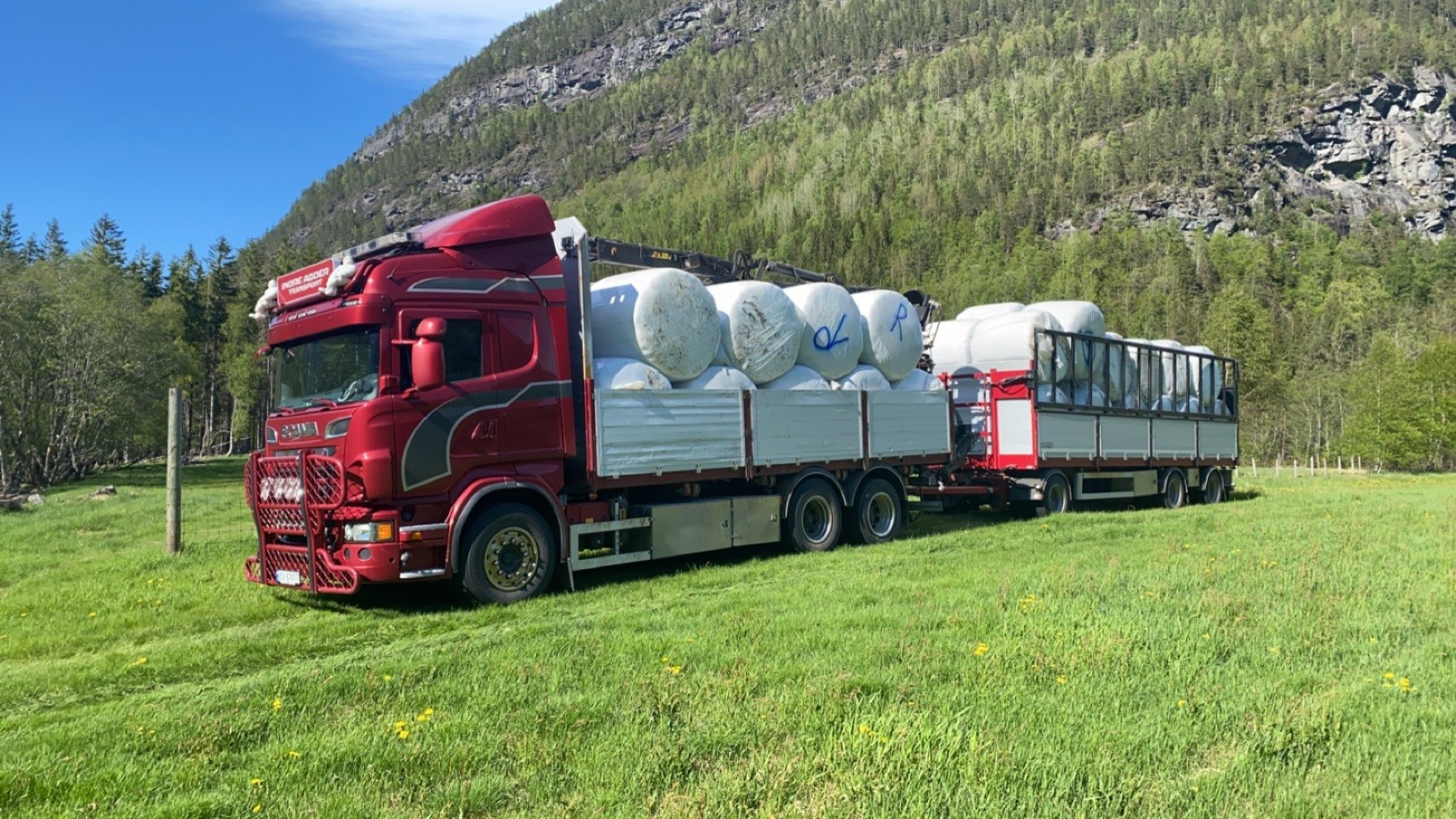 Transport med egnet kranbil for lasting og lossing av grassballer.